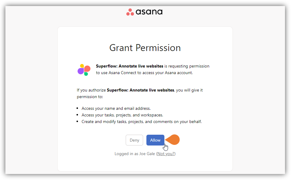 - You will be directed to the Grant Permission page, click Allow to allow Superflow to access your Asana account.