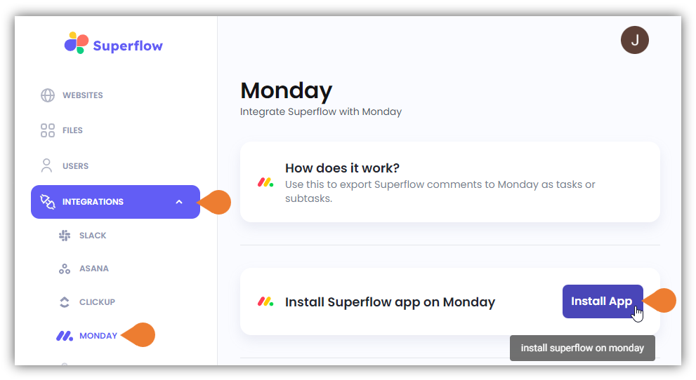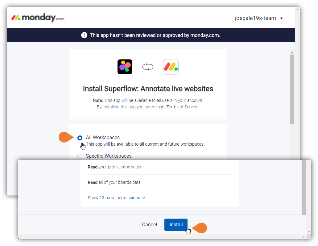 - Click the Install button. Once Superflow is successfully installed, you will be directed to Monday.com’s Manage Apps page.