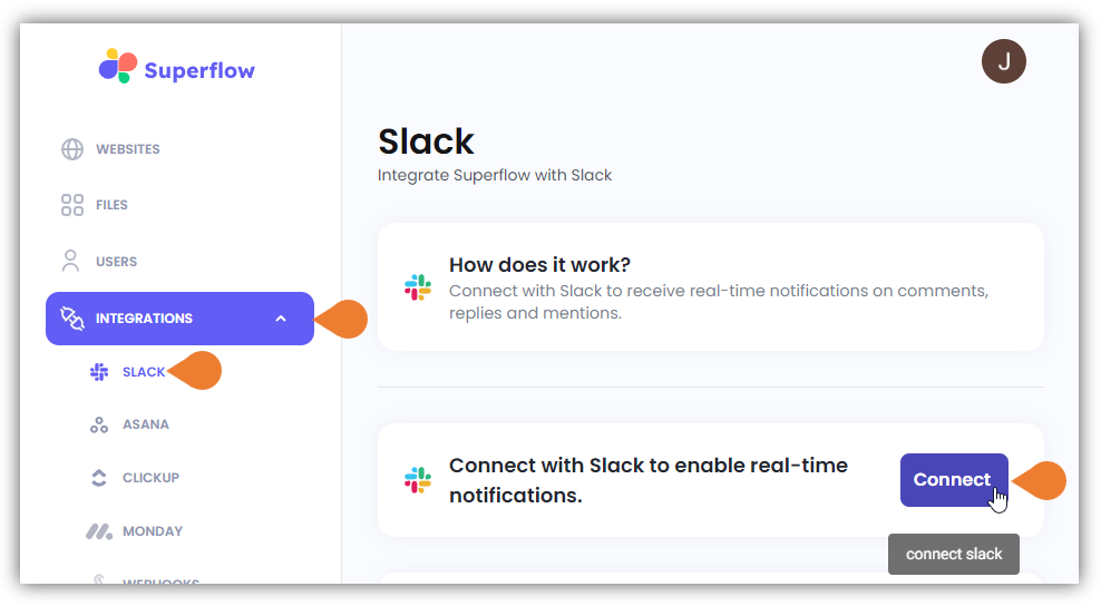 - Select SLACK to access Slack’s integration page and click Connect to start the integration.