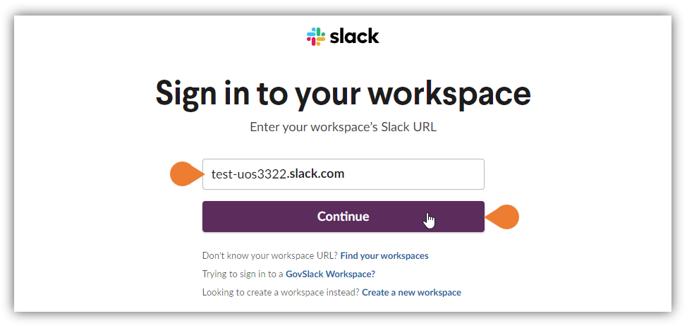 - You will be directed to Slack’s integration page. In the Workspace field, enter the workspace’s URL and click Continue.