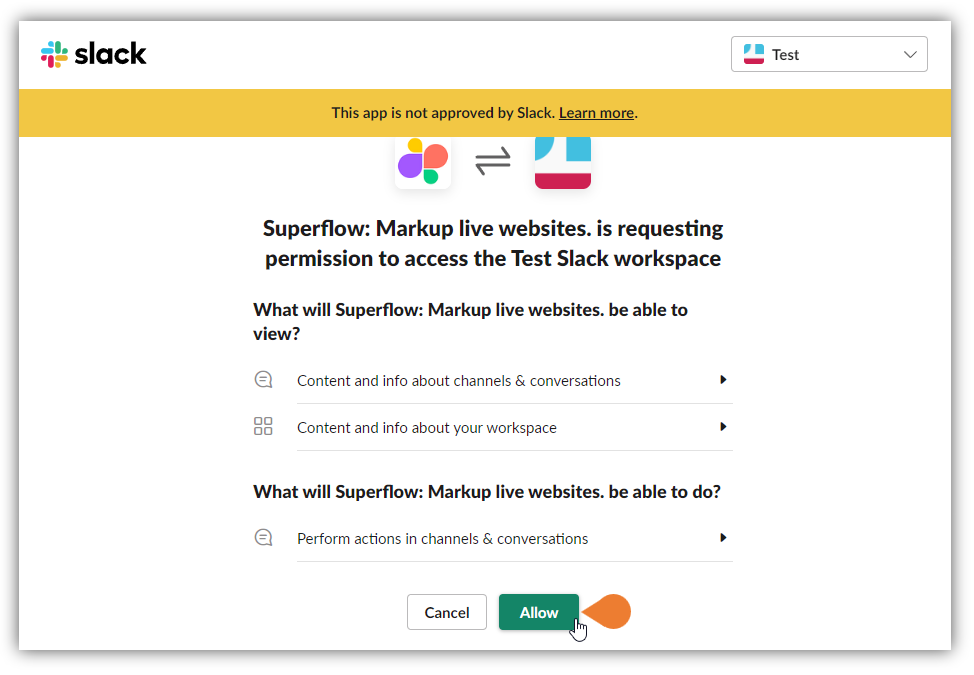 - You will be directed to the confirmation page, click Allow to allow Superflow to access the specified workspace.