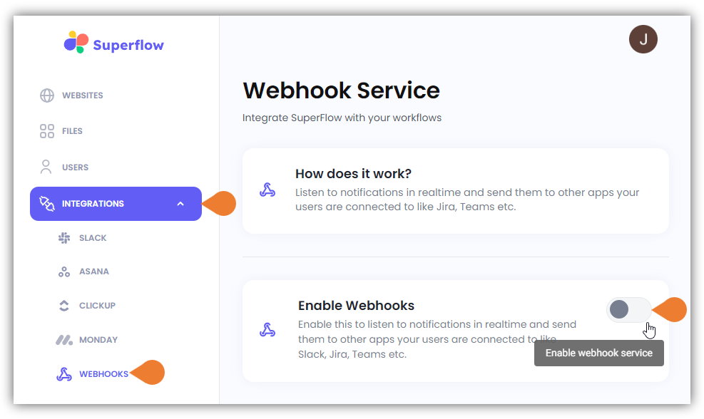 - Click the Enable Webhooks Toggle bar to enable Webhooks services.