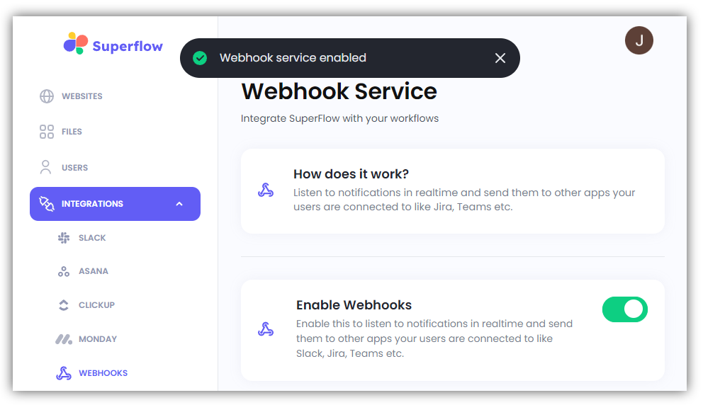 - After enabling the Webhooks, a Confirmation message will appear that the Webhook service is enabled.