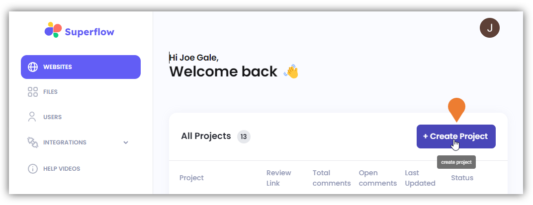 In this article, you will learn how to create a new project from the Superflow Dashboard. Access the Superflow Dashboard by going to app.usesuperflow.com. Alternatively, when you are in Review Mode, you can use the method below:- Find the Superflow Toolbar and click the More Options icon.