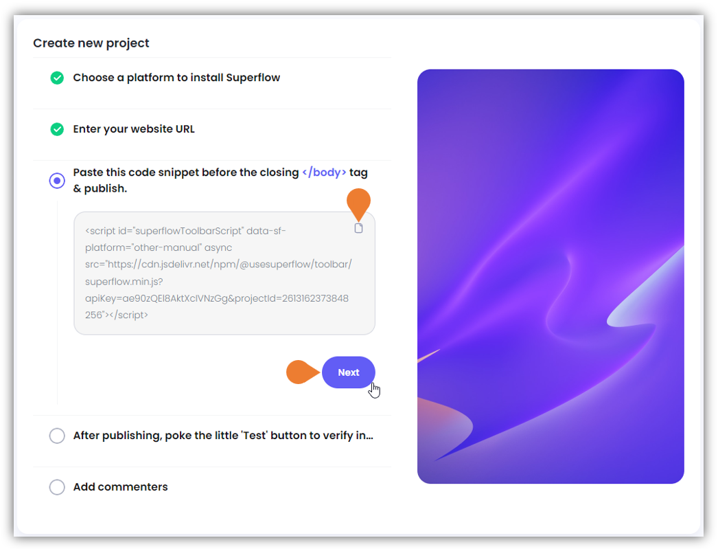 - In the Install Code Snippet section, copy the snippet using the Copy icon and paste it on your website. Click Next to continue.