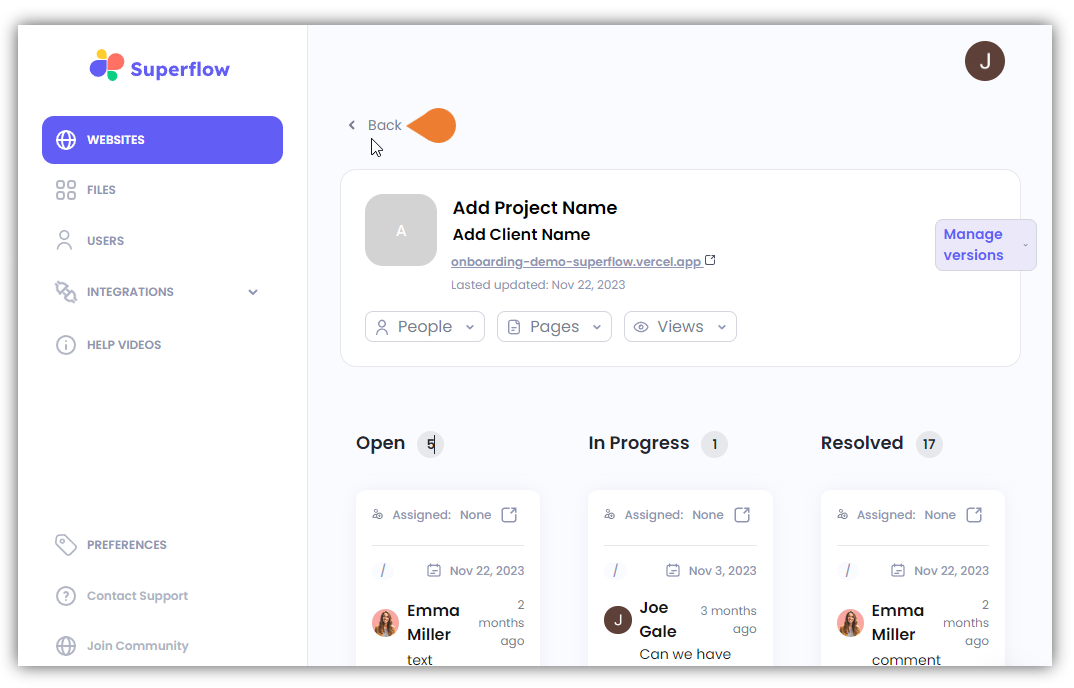 - By default, when accessing the Project Dashboard, you will be directed to the Dashboard for Comments Status screen or the Kanban Board. To access the Projects list, click the < Back or the WEBSITES module.