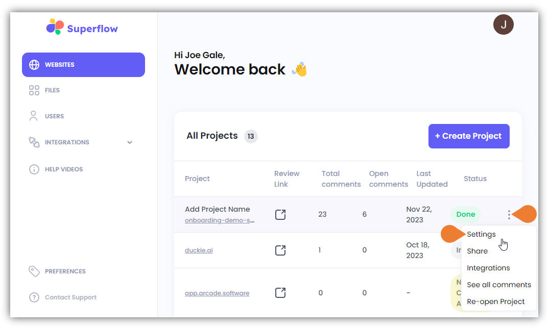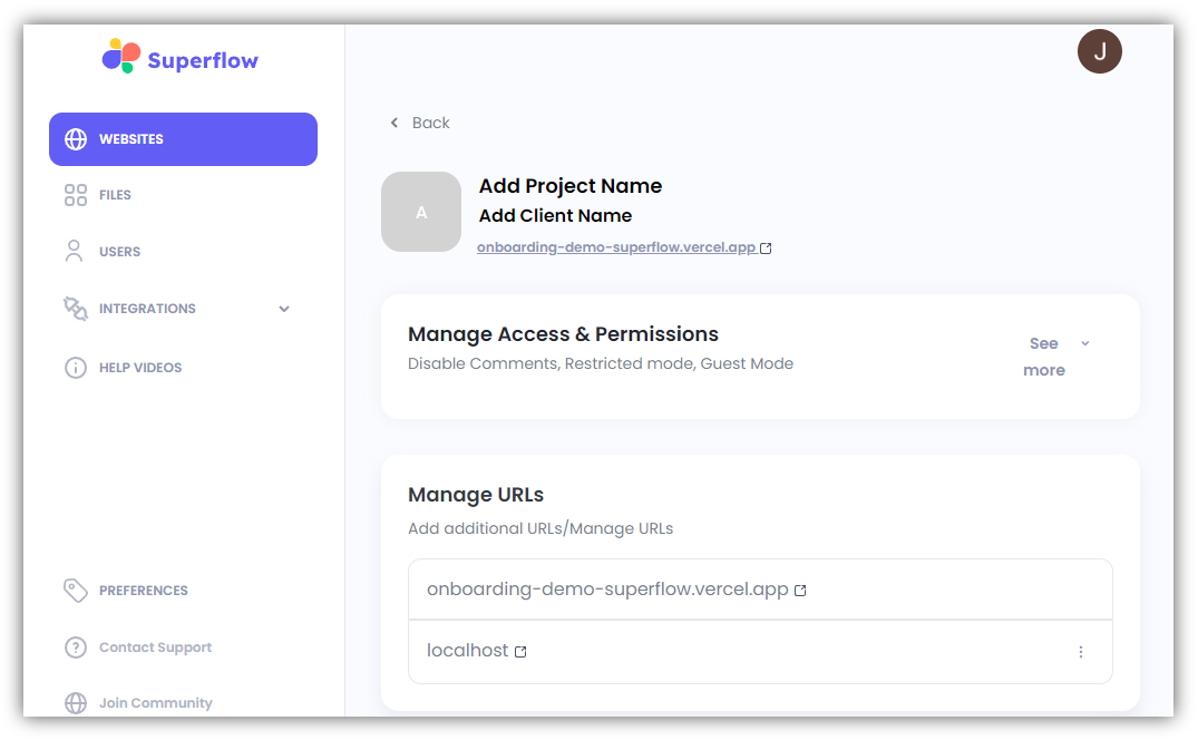 In this article, you will learn how to access the project settings. The Project Settings enable you to specify more project details, manage permissions, define project configuration, migrate Superflow data to another URL, access unique code, and view usage. Access the Superflow Dashboard by going to app.usesuperflow.com. Alternatively, when you are in Review Mode, you can use the method below:- Find the Superflow Toolbar and click the More Options icon.