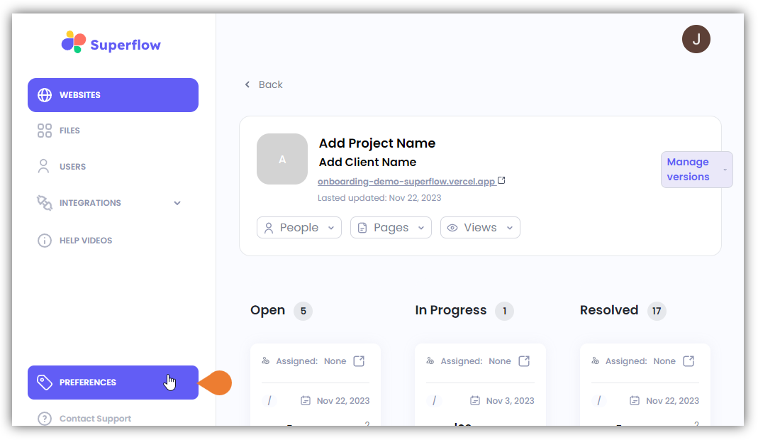 - A new tab will direct you to the Project Dashboard page.