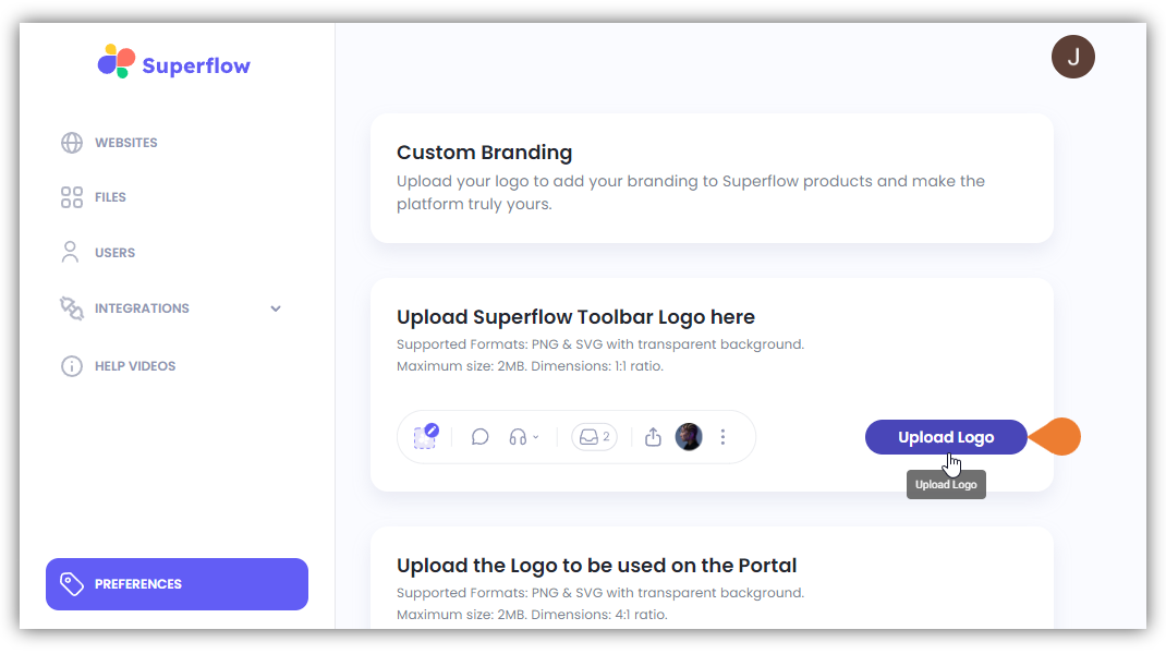 - There are two (2) branding sections that you can customize; (a) the Superflow Toolbar Logo and (b) the Portal Logo.