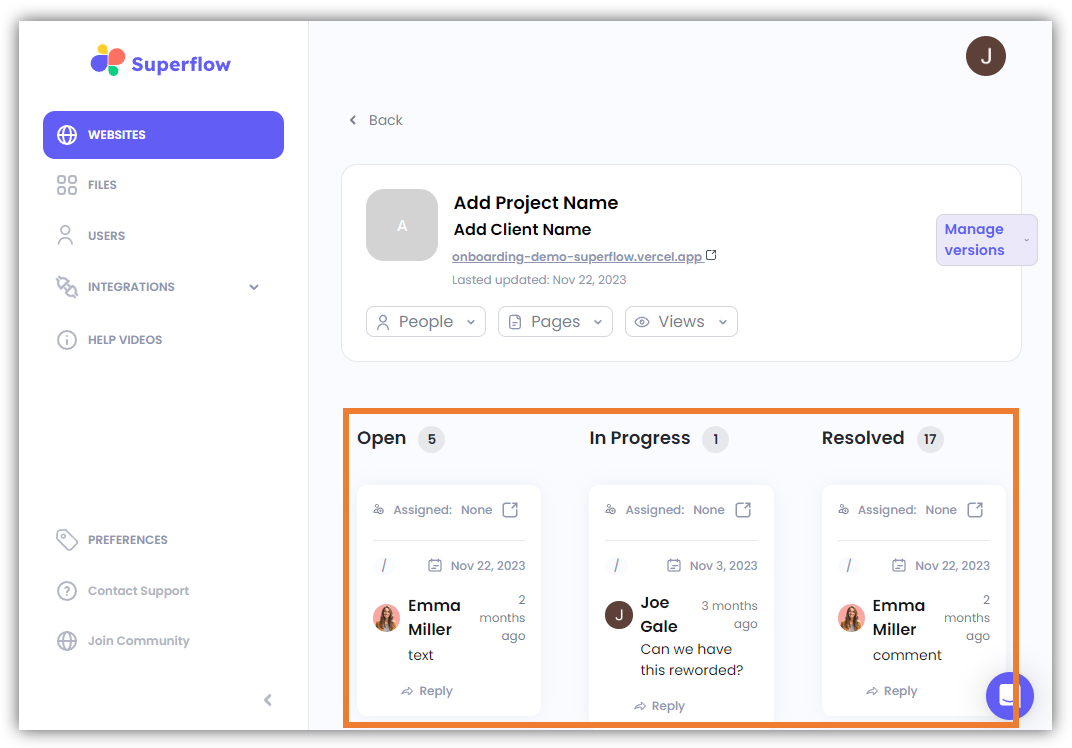 - On this screen, you see all the comments on this project which are categorized by the following statuses: