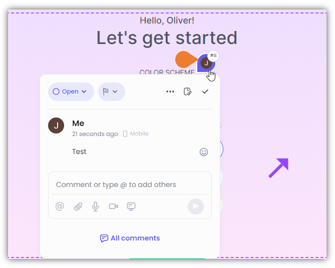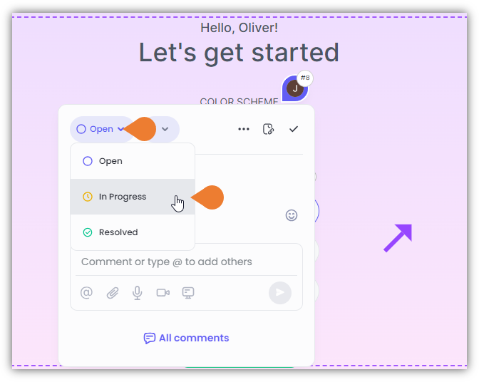 In this article, you will learn how to change the comment’s status. There are three (3) types of statuses including (a) Open, (b) In Progress, and (c) Resolved. It is worth noting that there are a couple of ways to change the comment status either by creating a new comment or updating the status of a current comment. In this example, we will use the latter.- On the screen, find and click the Comment that you want to update.
