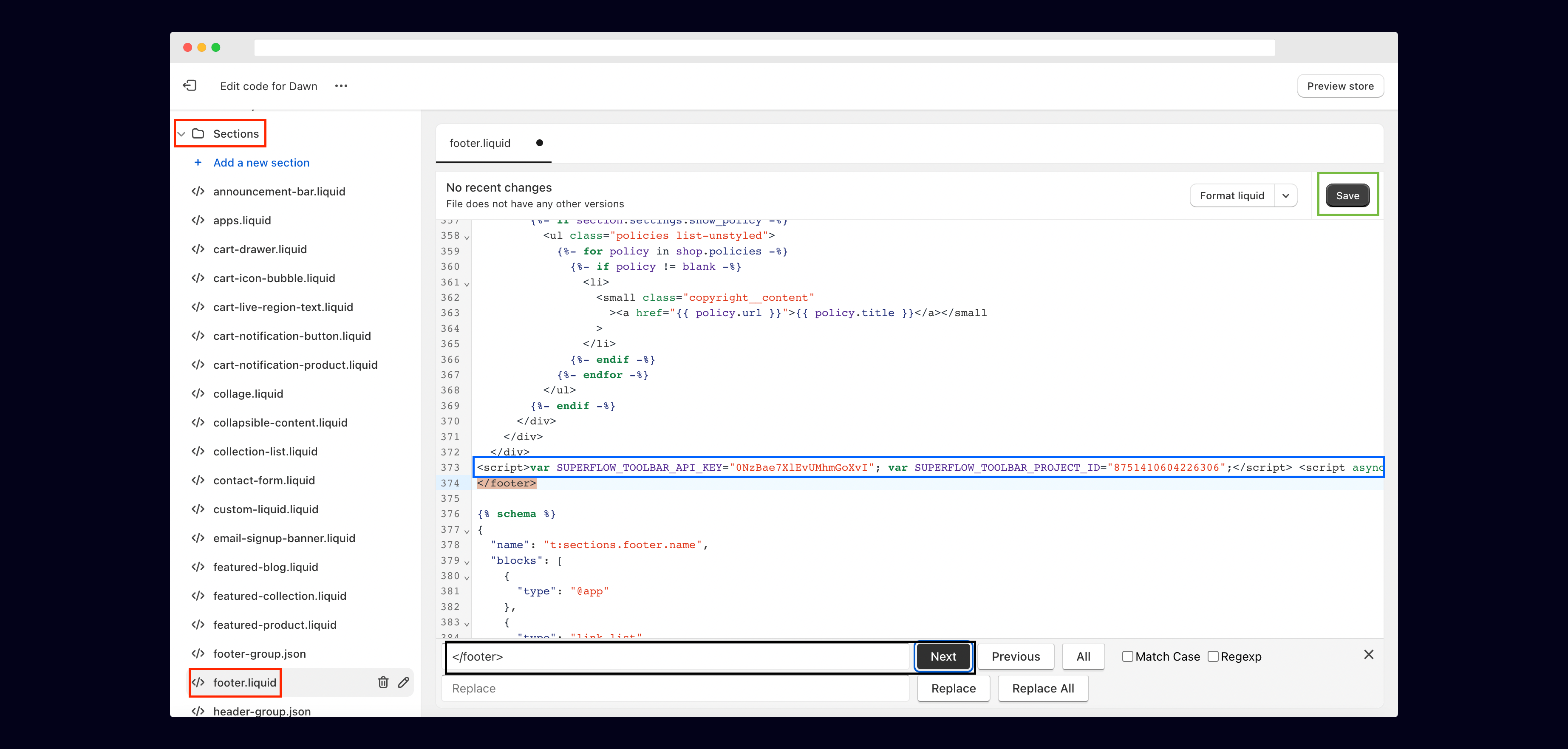 5) Add your unique Superflow code in the Footer section