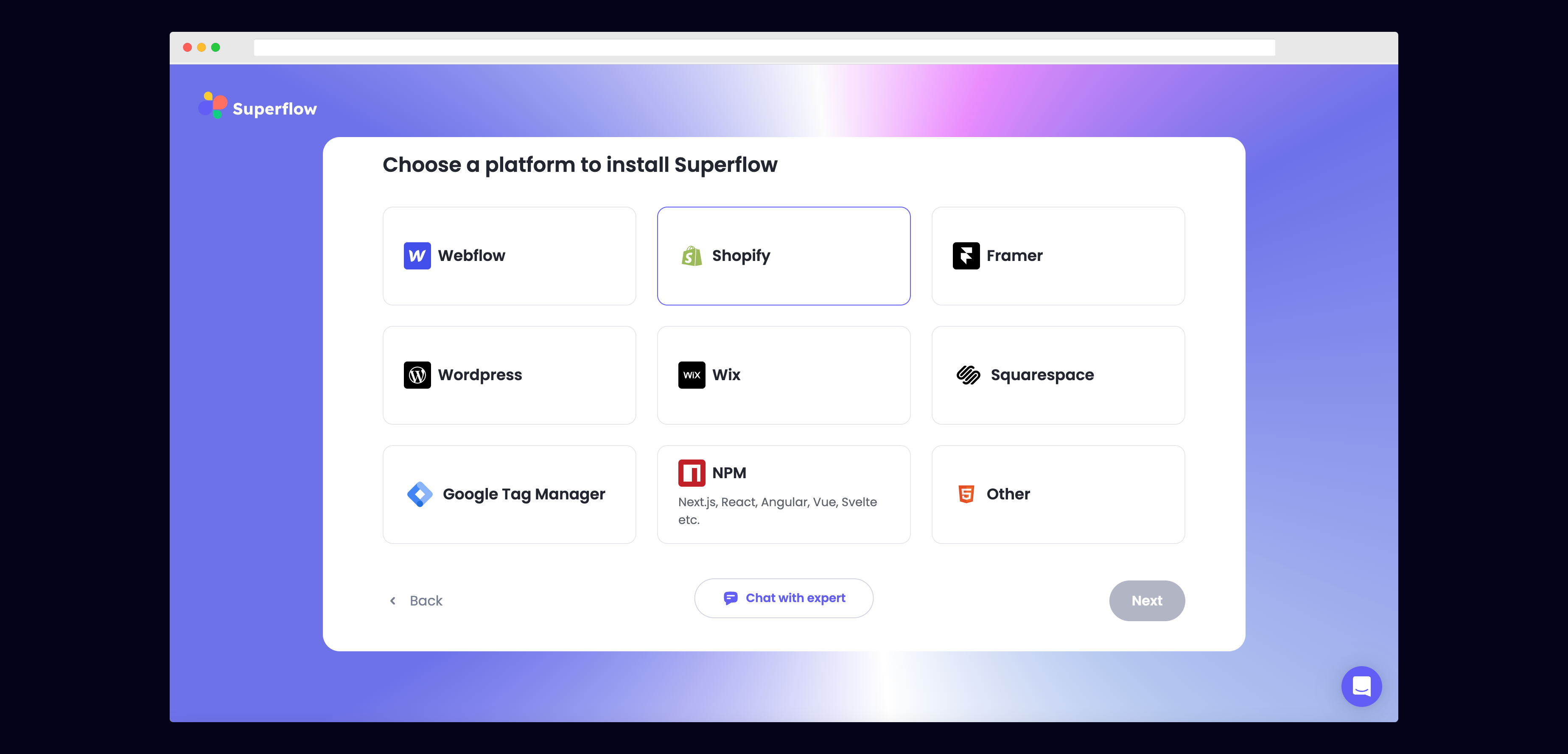 Choose Shopify from the list of options to install Superflow with Shopify.