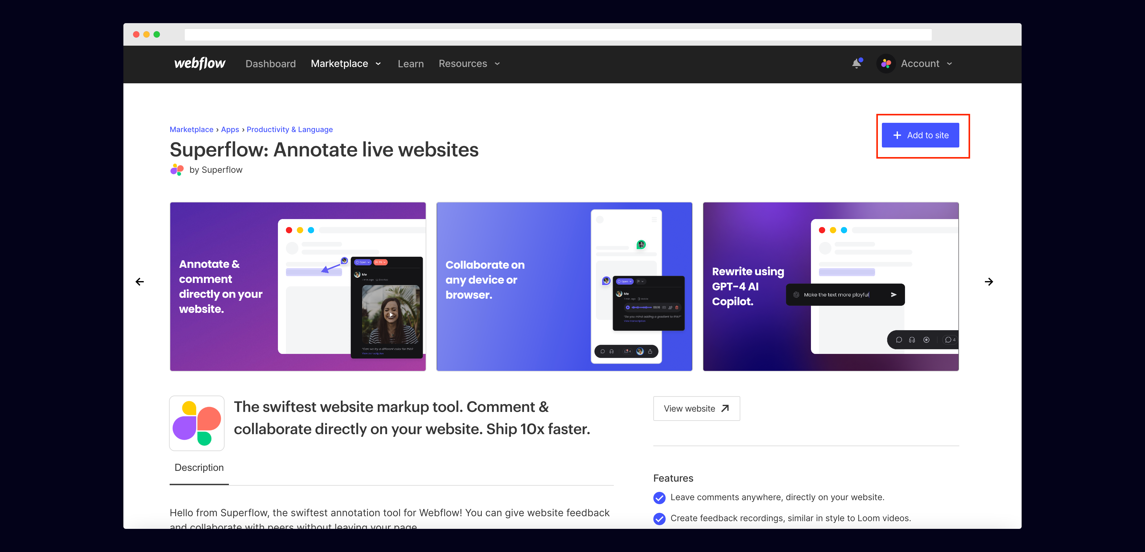 Navigate to the Superflow app on the Webflow Marketplace by going to this link.2) Click ”+ Add to Site”