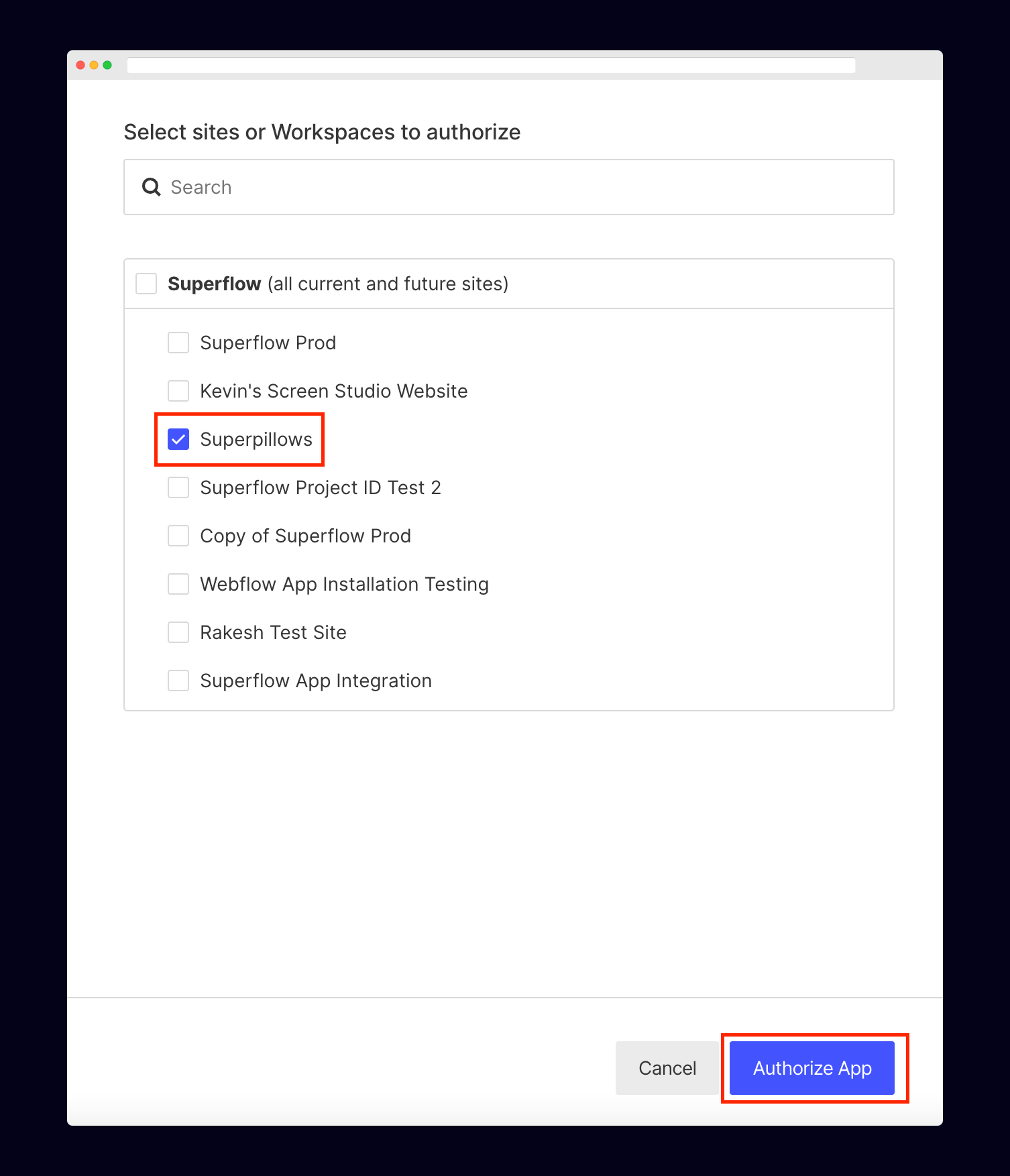Select the Webflow sites you want to add Superflow to. Then click Authorize App.