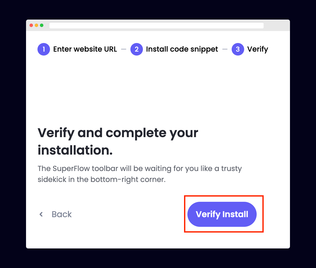 Click the Verify Install button to verify that Superflow was installed correctly on your Webflow site.