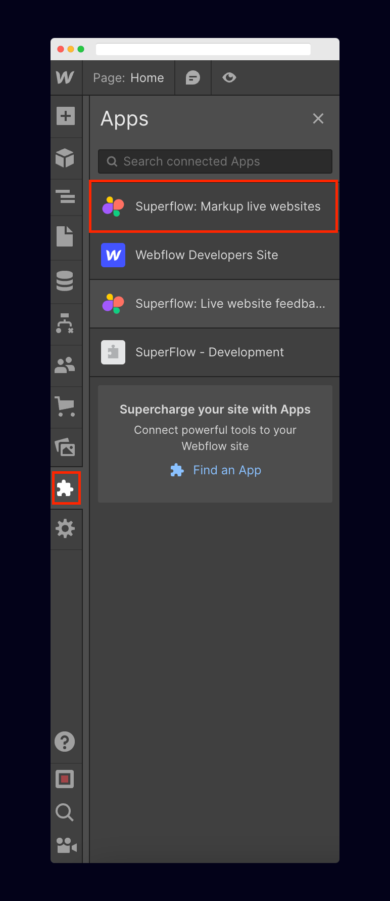 To access the Superflow extension, go to your Webflow site’s designer section and click on the Apps button on the side menu. Then hover over the Superflow app and click Launch.