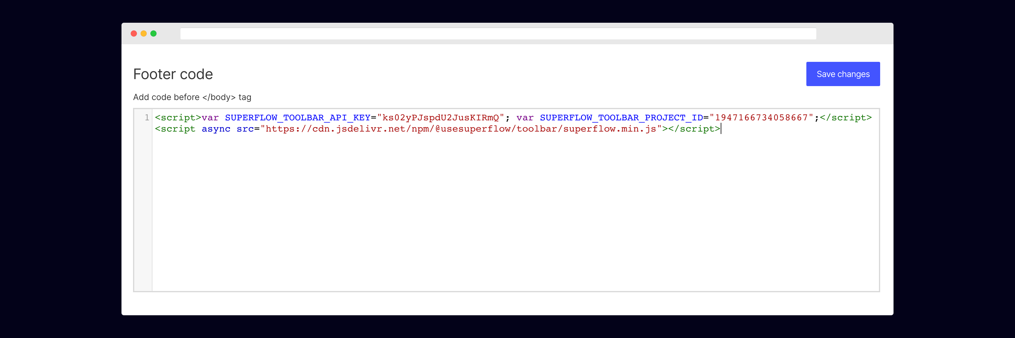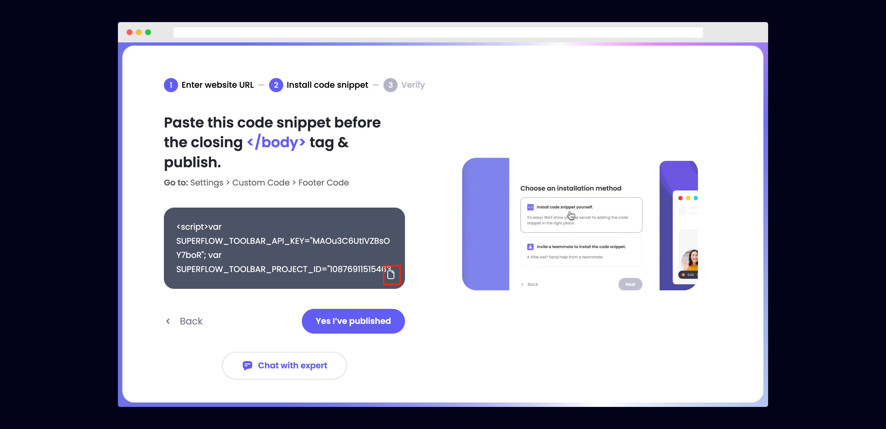 You can copy your unique Superflow code from the onboarding flow or from your project settings in your dashboard.