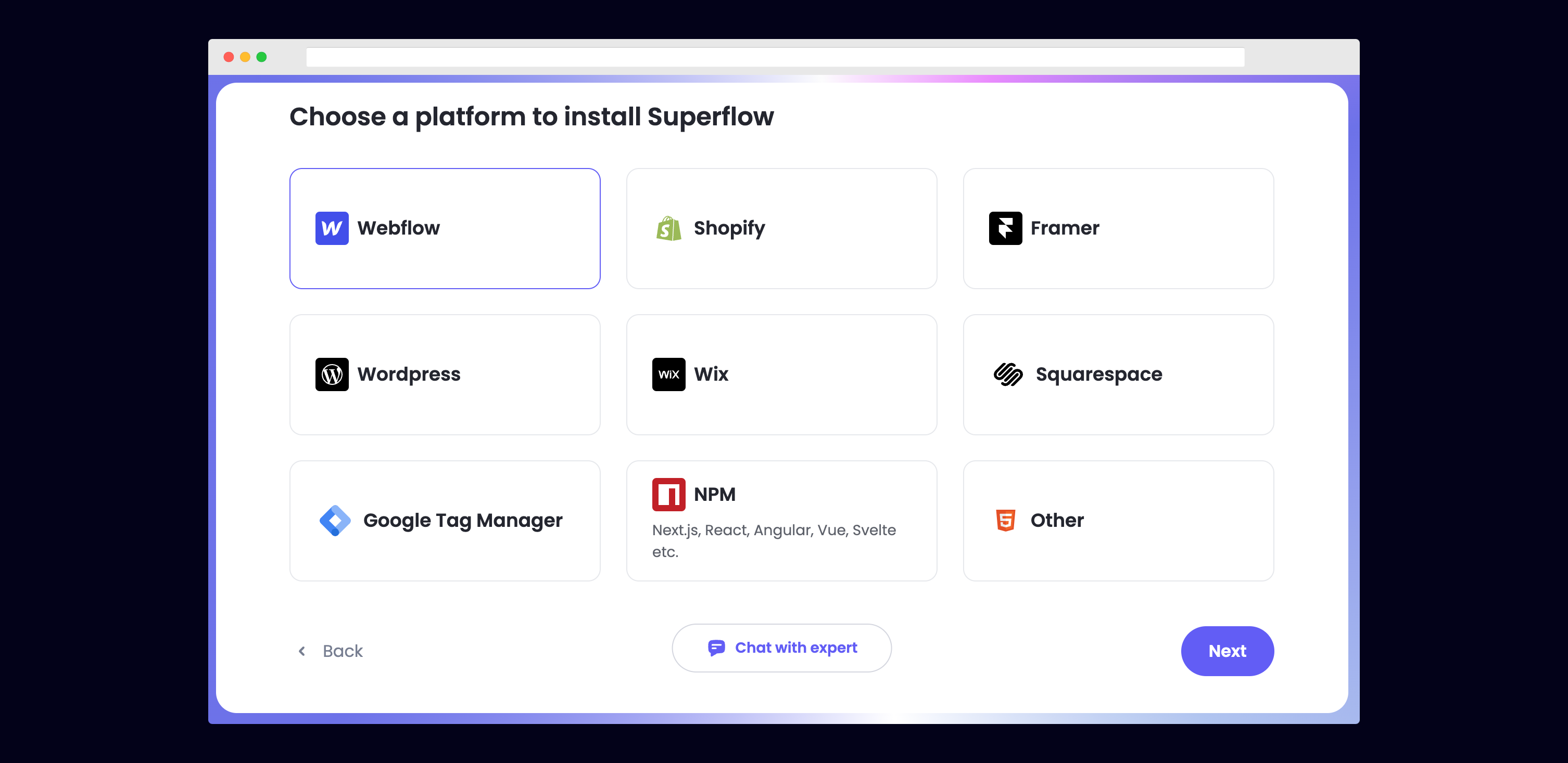 Choose Webflow from the list of options to install Superflow with Webflow.