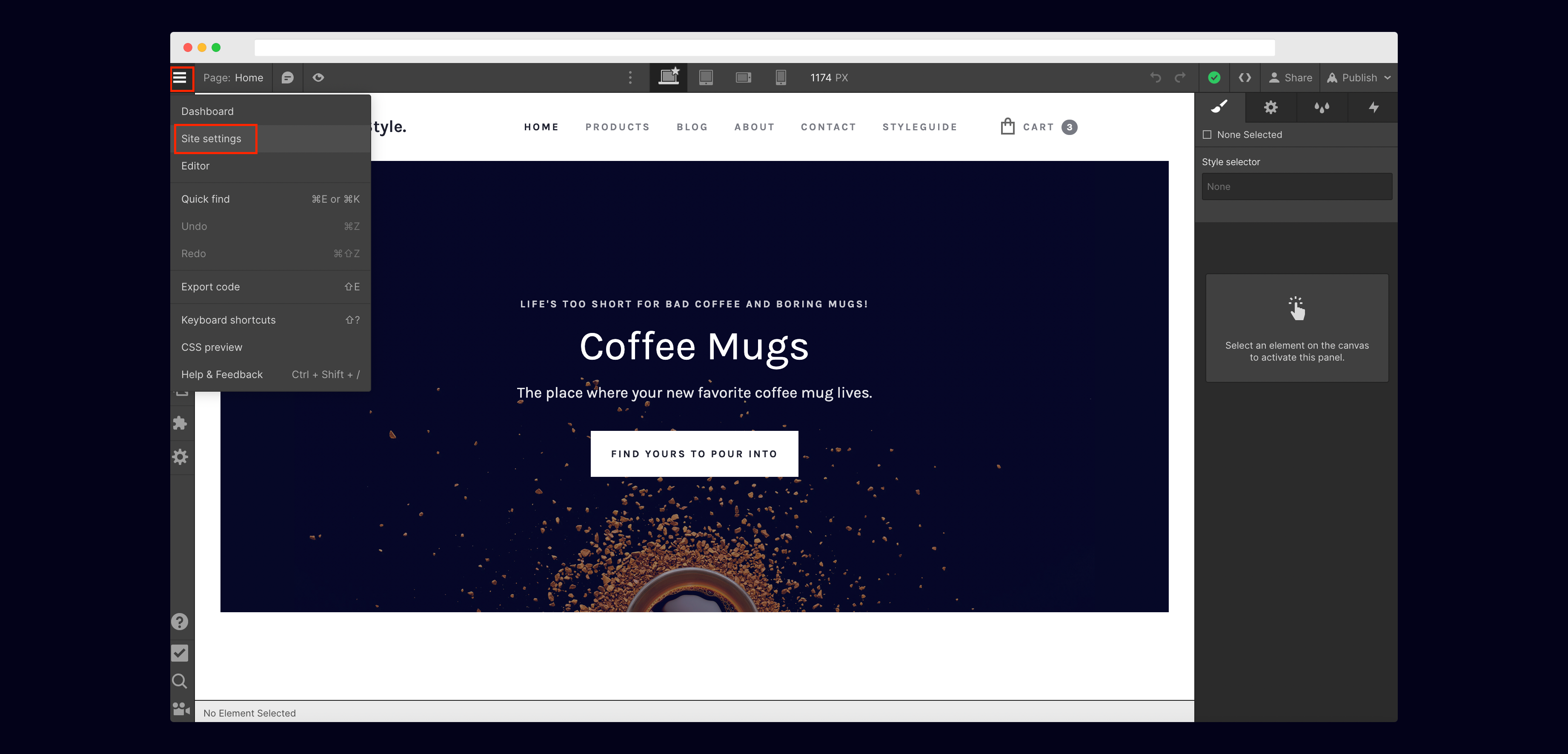 You can get to Site Settings by clicking the dropdown menu in the top left.