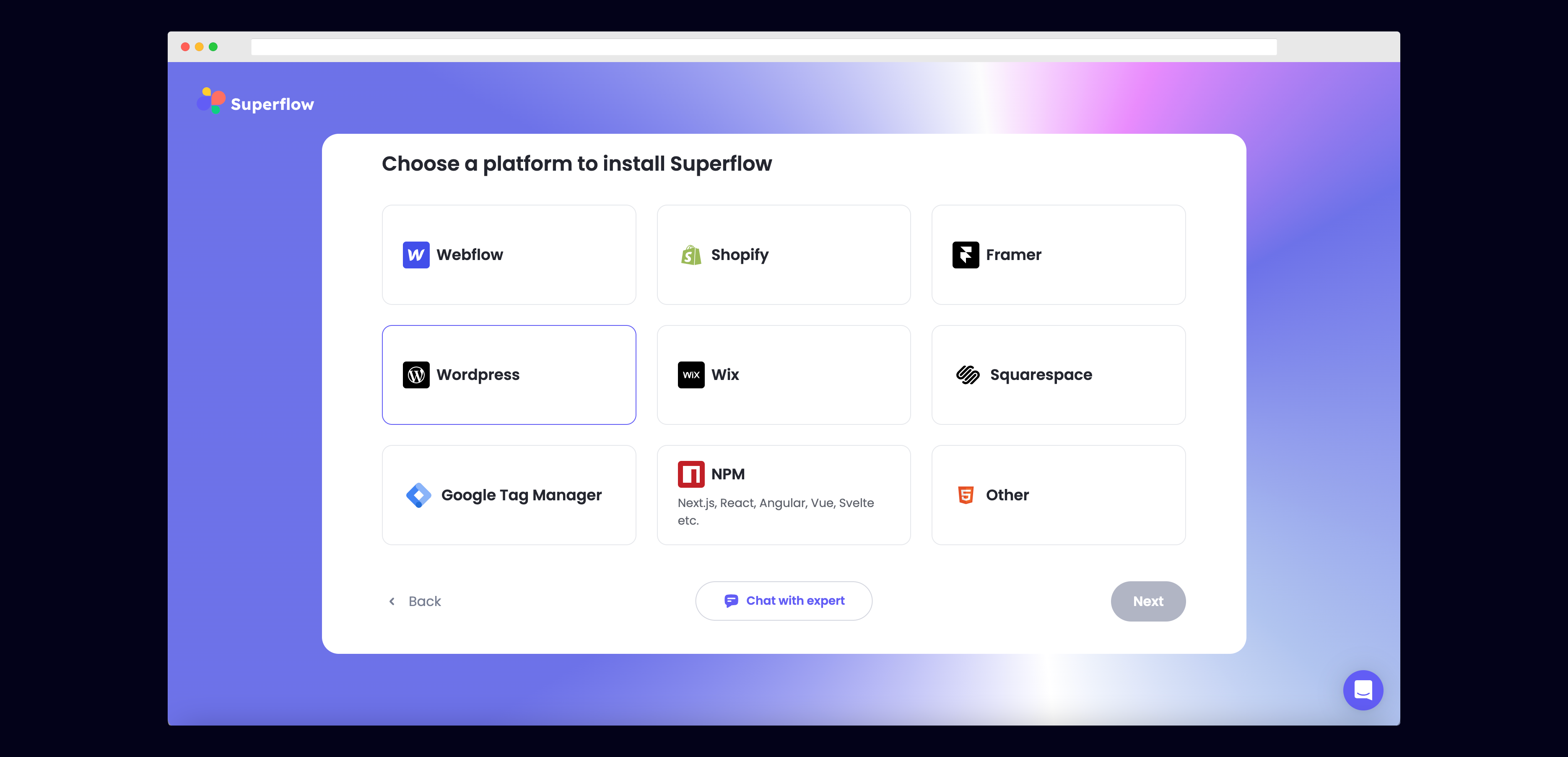 Choose Wordpress from the list of options to install Superflow with Wordpress.