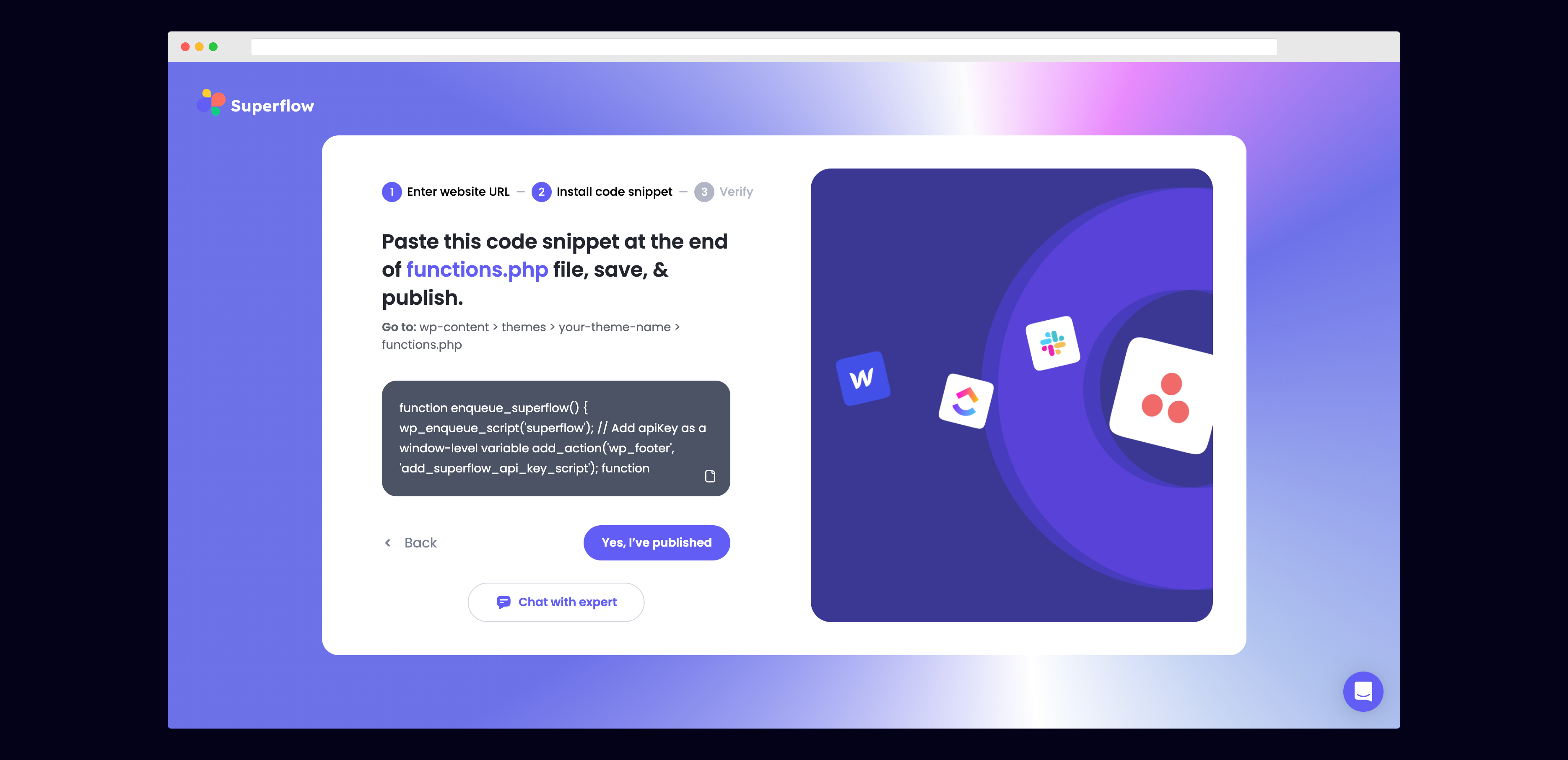 You can copy your unique Superflow code from the onboarding flow or from your project settings in your dashboard.