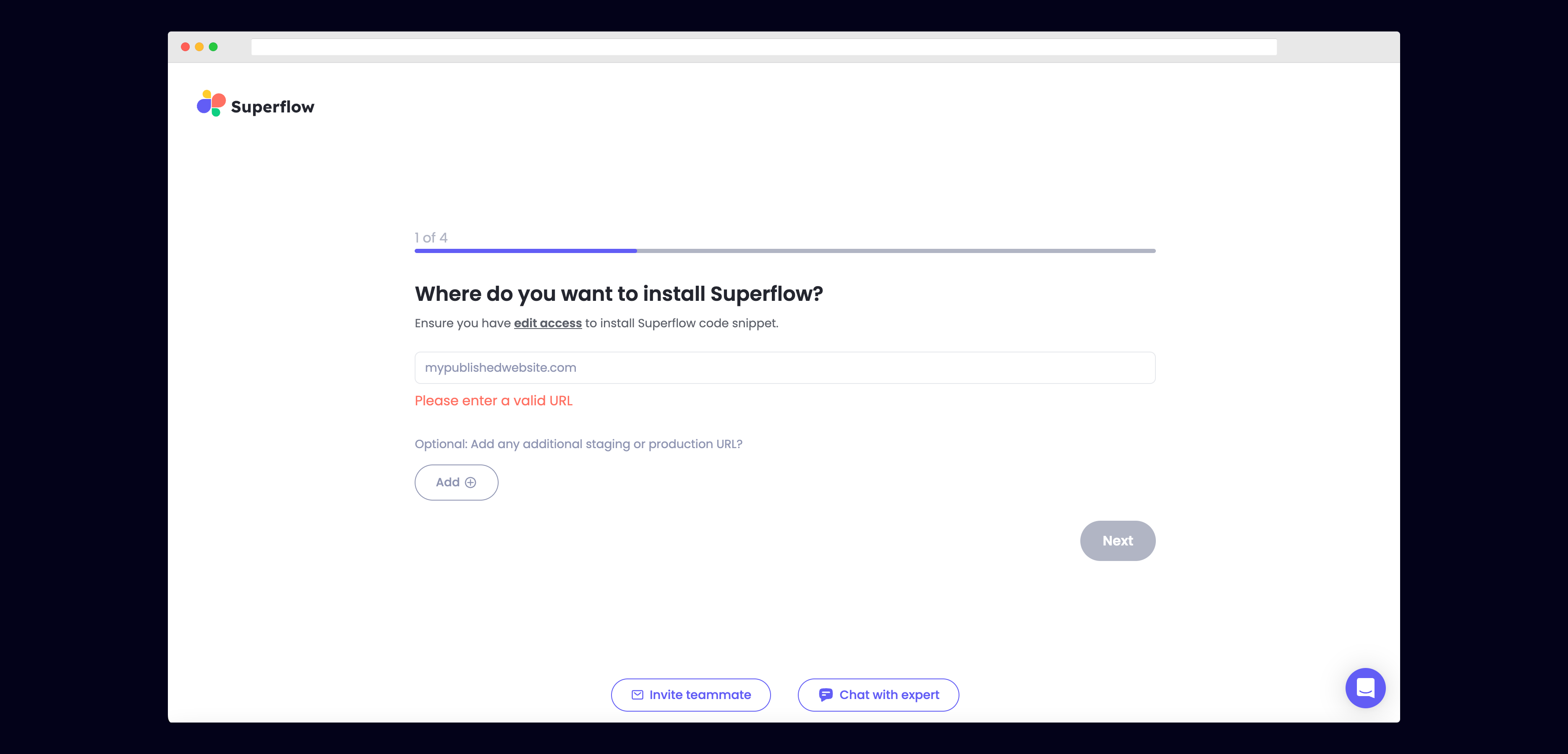 Now that you have verified that Superflow has been installed on your Vue site, navigate to your published site and add?review=true at the end of the URL to enable Superflow.