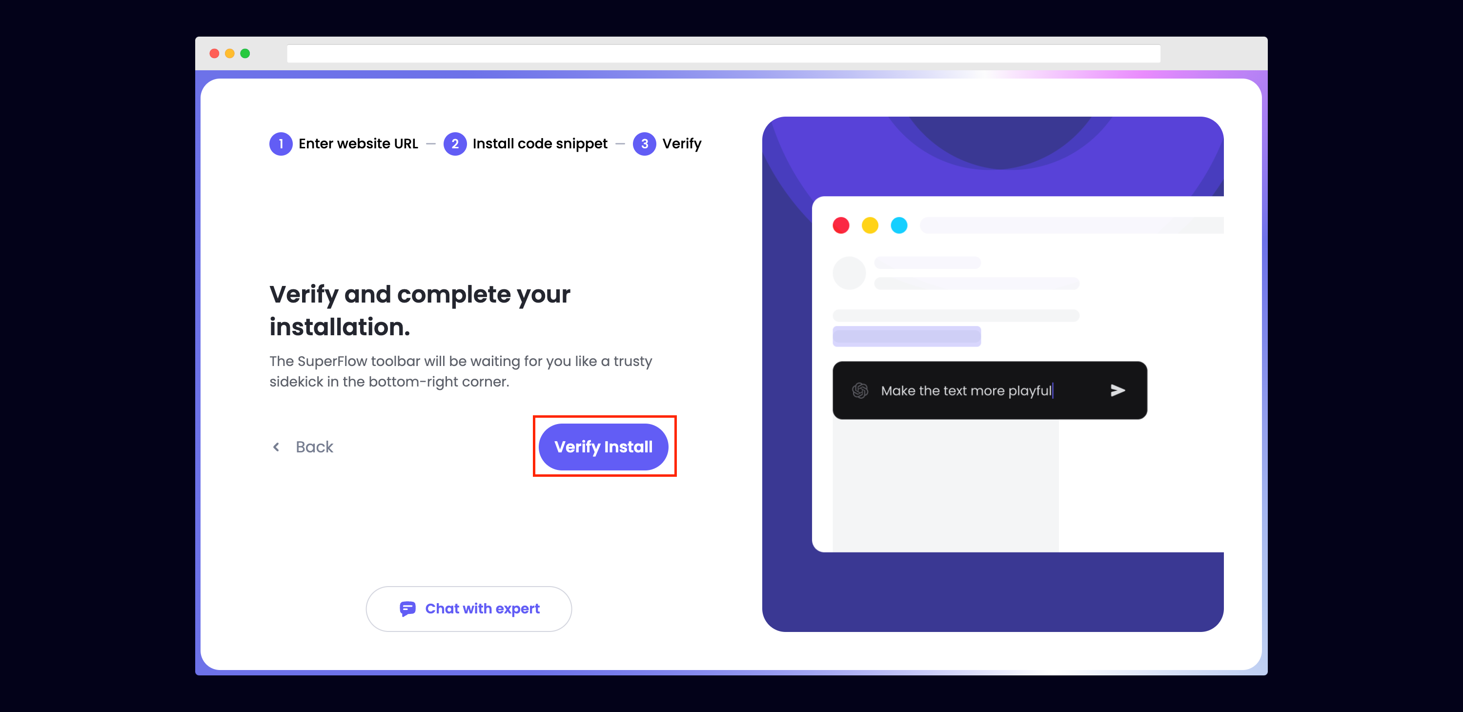 Verify your Superflow installation by clicking the Verify button on the onboarding flow.